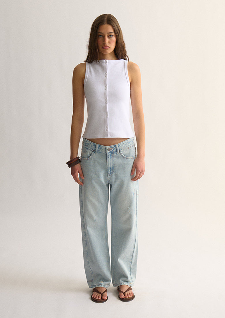 We're redefining simplicity with our 90's Button Singlet. Made from a firm ribbed cotton blend with the perfect amount of stretch, it's designed for comfort and a sleek silhouette. The elegant high boat neckline and a distinctive button-up front, make this a simple yet truly elevated basic for your wardrobe.
