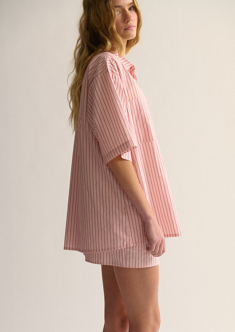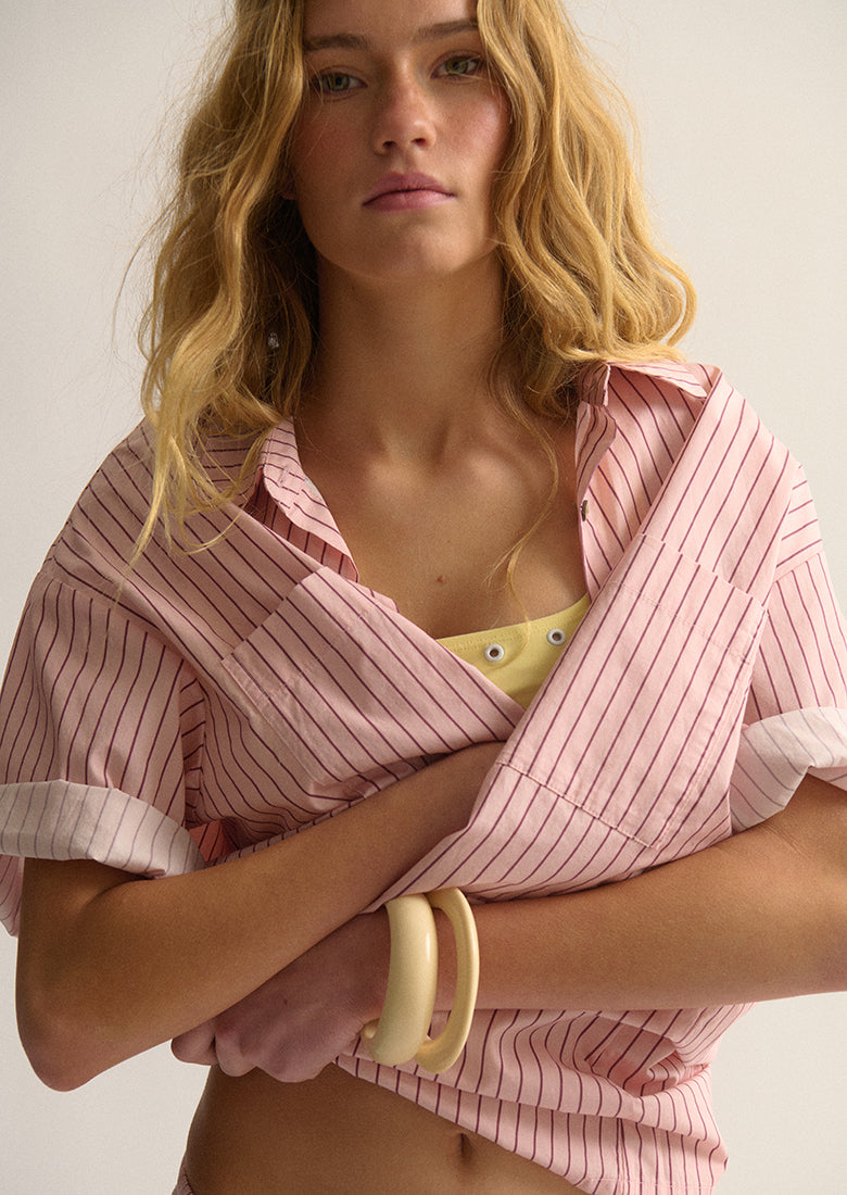 Get the perfect balance of comfort and modern style with our Allegra Short Sleeve Shirt. Designed with an oversized, boxy fit, classic collared neckline, and short sleeves, this 100% cotton shirt feels as good as it looks. With practical double chest pockets and sleek fabric-covered buttons, it’s the essential piece for a cool, contemporary wardrobe.