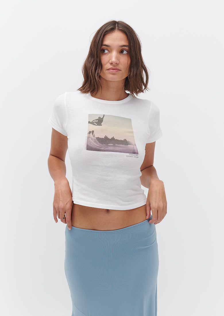 Bring street-side cool to your everyday look with the Allegra Tee. Designed in a slim, mid-length silhouette, this tee features a high ribbed neckline and cap sleeves for a sleek, modern edge. The screen-printed design adds a unique finish, while the lightweight cotton keeps it breathable and slightly sheer for an effortlessly chic vibe. Perfect for pairing with denim or layering under your go-to jackets.