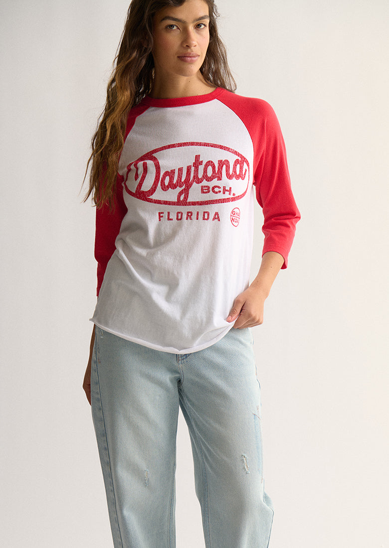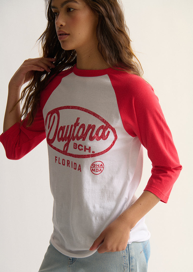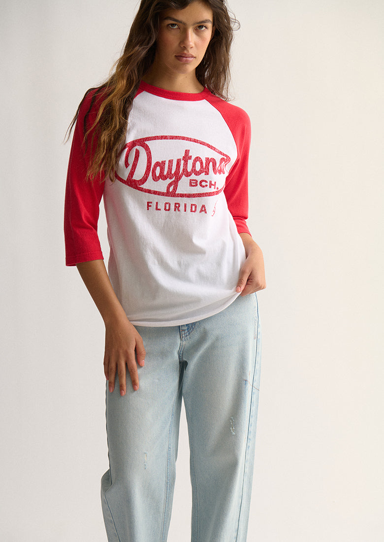 Nail that vintage-sporty look with the Beverly Chopped Sleeve Tee. Made from soft, 100% cotton, this tee has a comfortable regular fit. Featuring a raglan design, 3/4 length sleeves, and a crew neckline, while a standout chest screen print and raw scooped hem add the final details for a perfectly worn-in look.