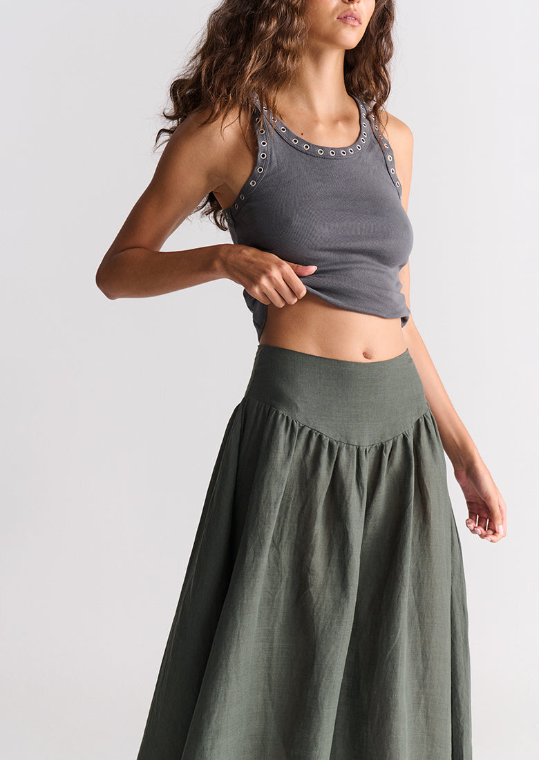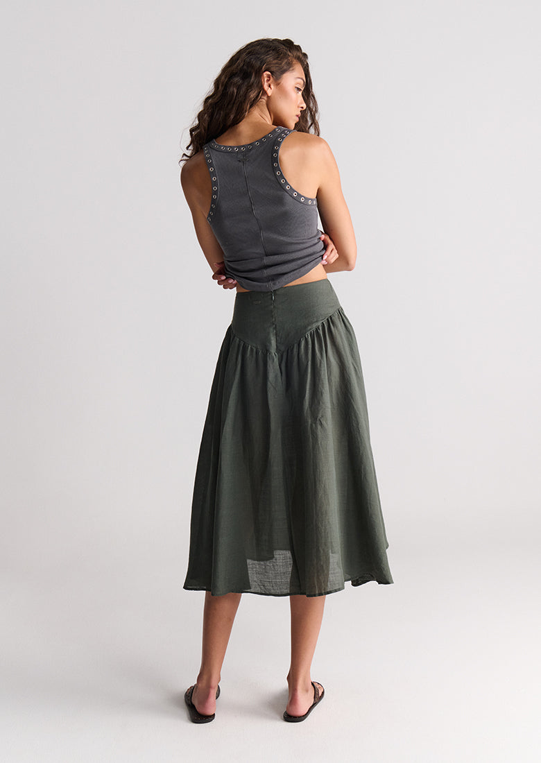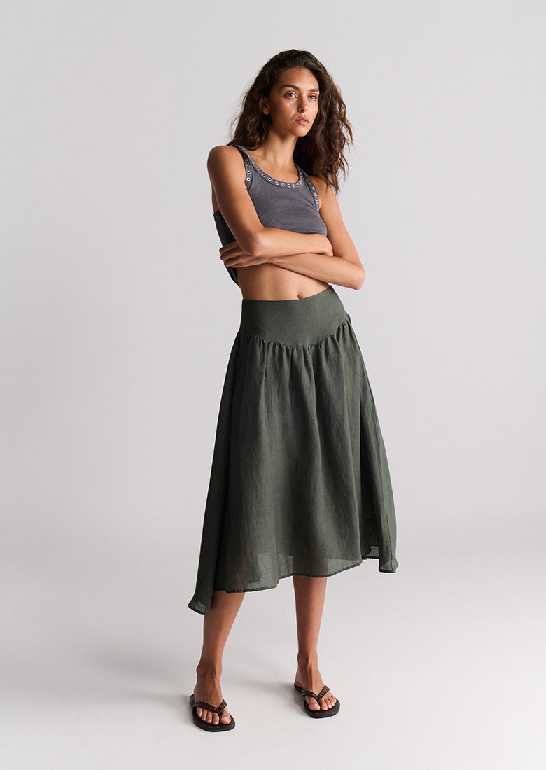 The Della Midi Skirt blends breezy movement with a seriously chic shape. Its midi length and fixed dropped waist create effortless lines, while the lightweight 100% ramie construction adds a semi-sheer, contemporary edge. Hidden side seam pockets and a clean back zipper maintain the skirt’s sleek, modern profile, making it perfect for year-round style.