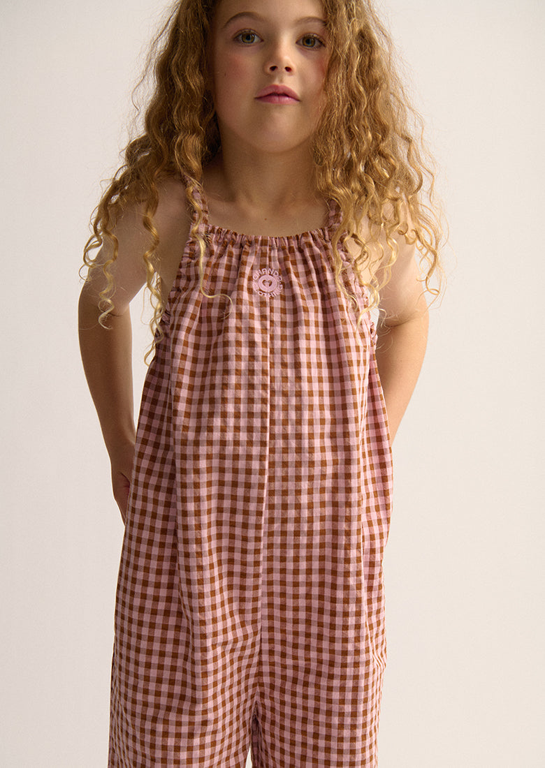 The Evie Jumpsuit is an instant favourite, with its sweet pink-brown gingham and delicate chest embroidery. Made from a lightweight cotton blend and featuring a high square neckline and stretchy straps, it’s a perfect blend of comfort and charm that’s ready for anything.