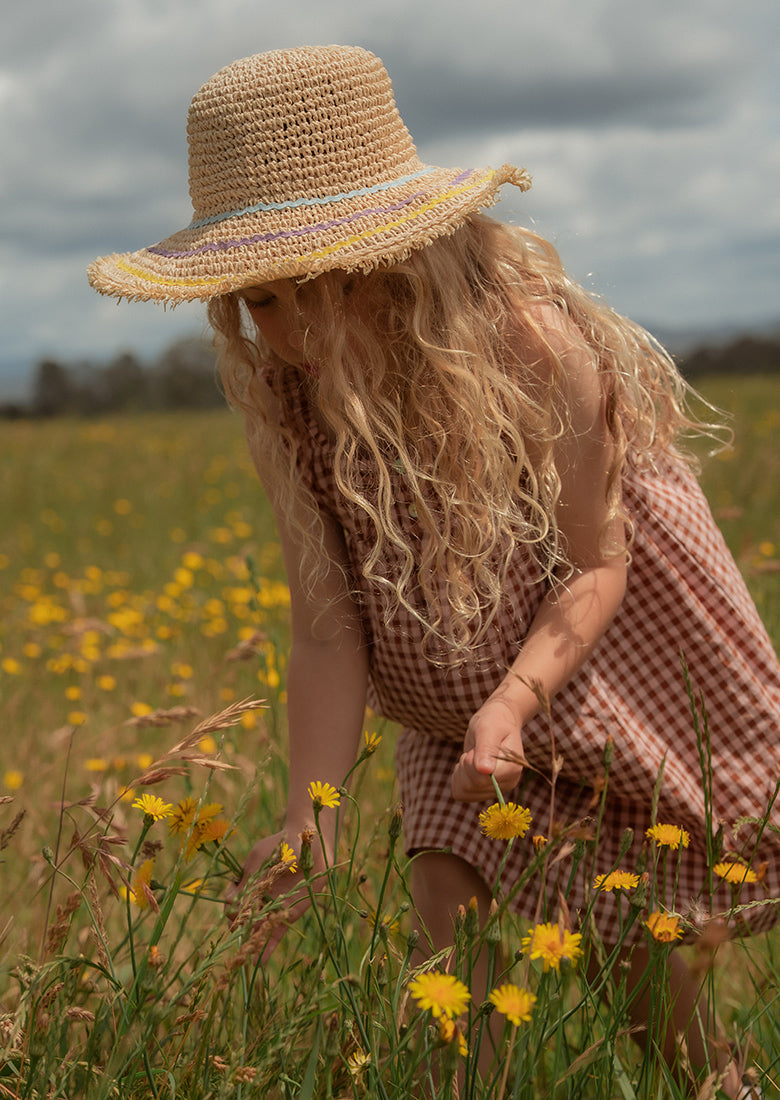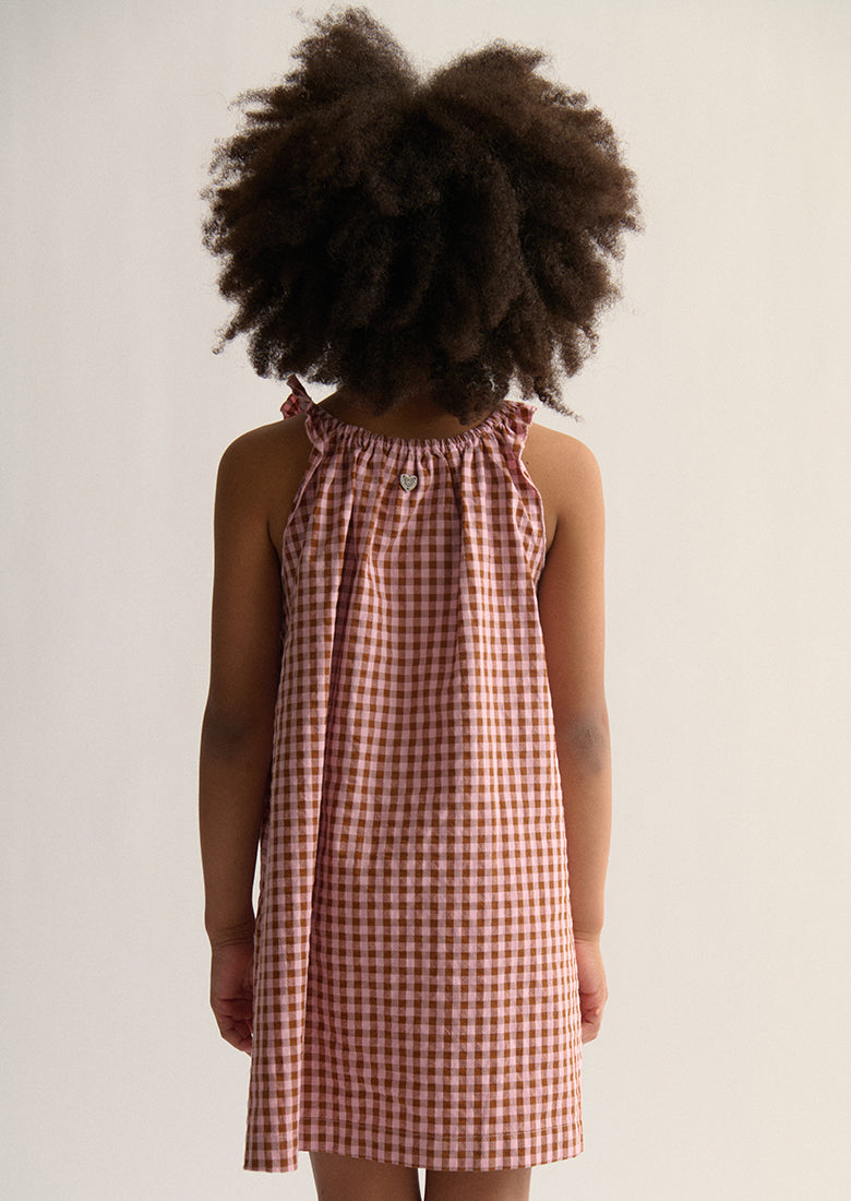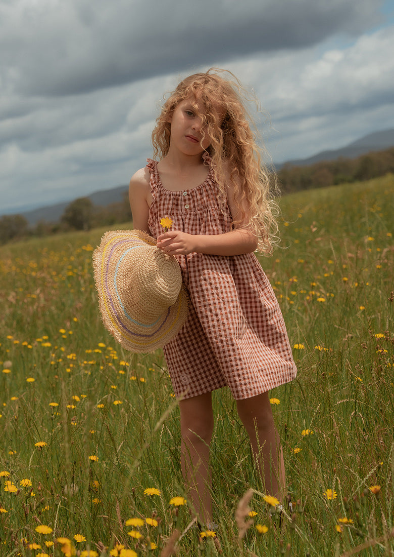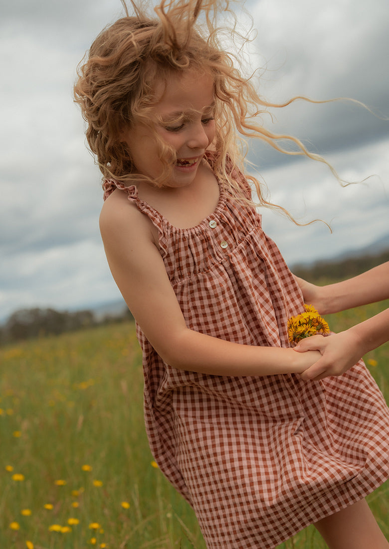 The Evie Mini Dress is made for sunny days and sweet adventures. With fixed frilly straps, a comfy elasticated neckline, and a lightweight cotton blend, this mini dress is as comfortable as it is cute. The classic gingham design and soft fabric make it a go-to for her all season long.