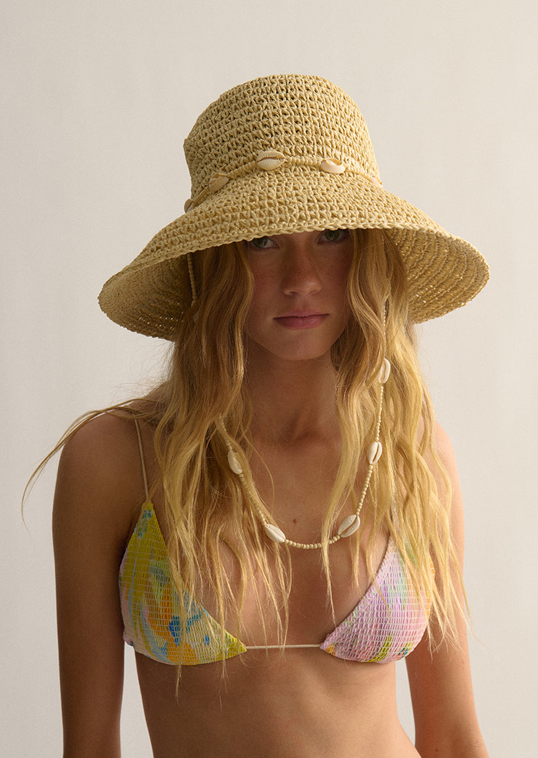 Sunshine, meet your match! Our Kai Hat features a wide brim and a beaded shell chin chain, and it's made from lightweight, 100% paper. This beachy must-have is the final piece you need to style your look head to toe this summer.