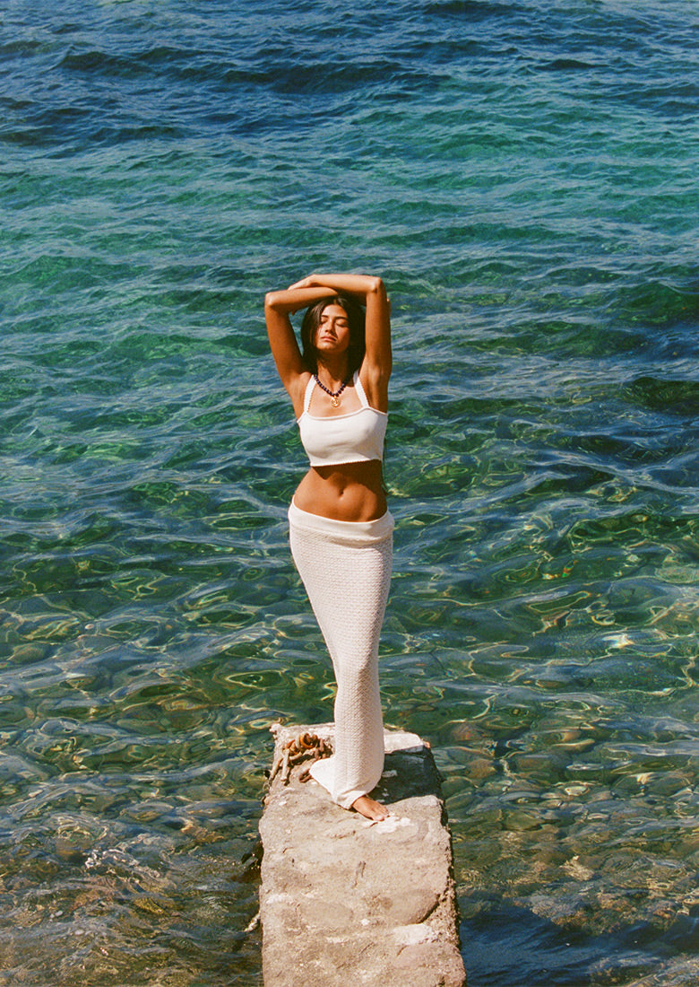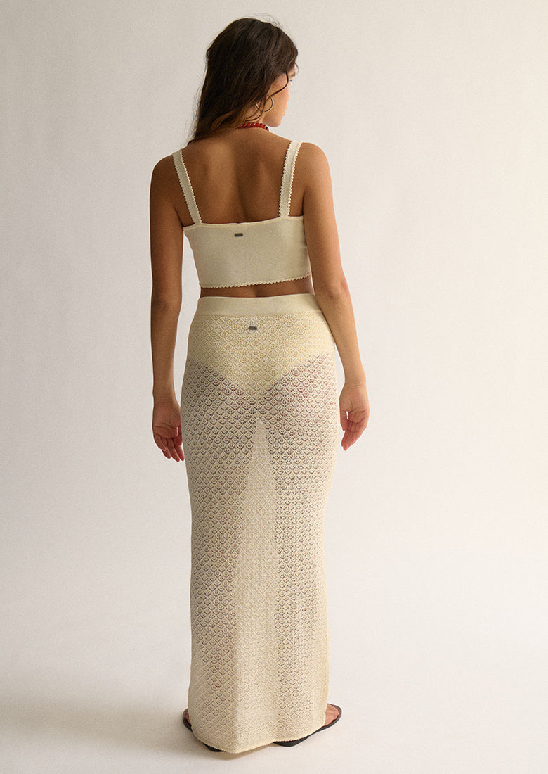 The Lana Maxi Skirt is a versatile showstopper, with a delicate sheer knitted design. The comfortable elasticated waistband and functional detachable briefs make it the perfect choice for effortless transitions—from a poolside lounge to a sunset dinner. This is the perfect blend of bohemian comfort and beach club chic.