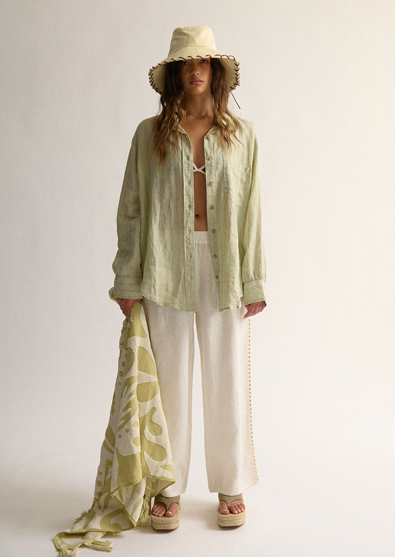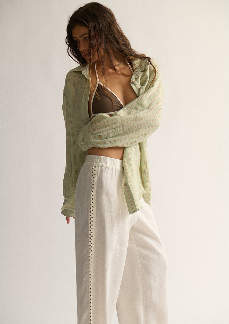 Sunset strolls and sun-soaked days were made for our Lana Pants. Crafted from a soft, semi-sheer 100% linen, they feature a comfortable mid-rise and a relaxed straight-leg fit. The beautiful embroidery stitching along the sides and hem adds the perfect handcrafted finish, making them ideal for an effortless beachy vibe.