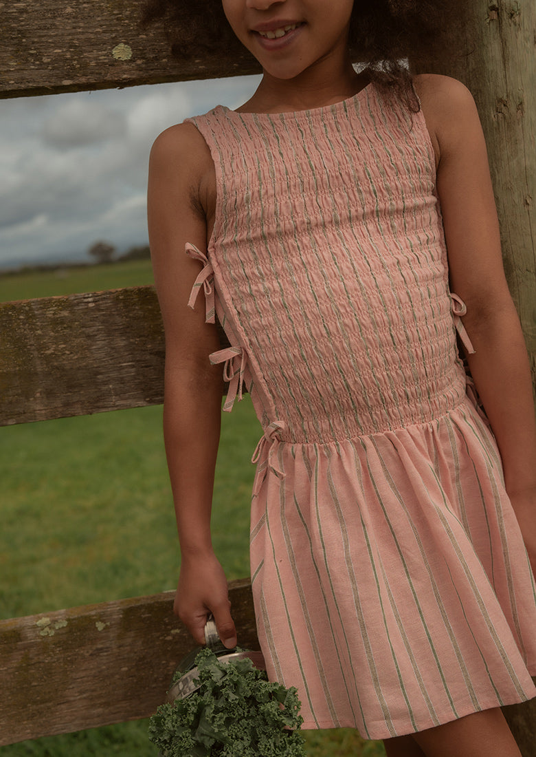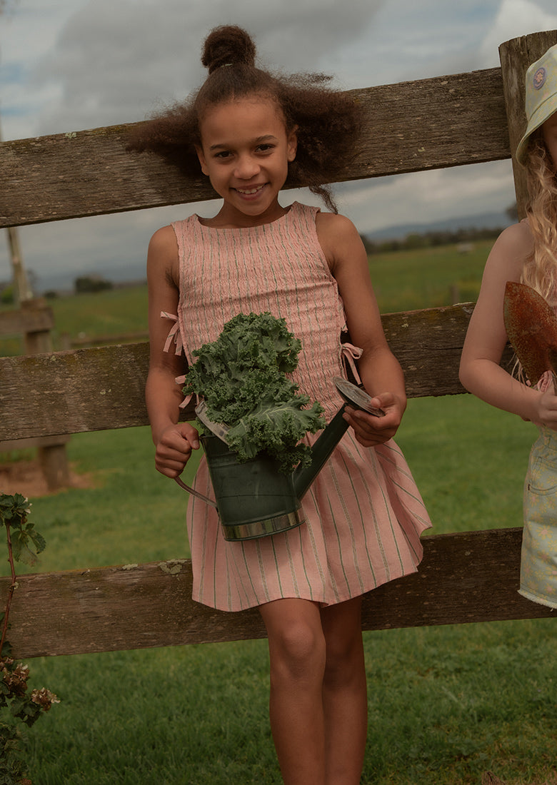 The Lucy Mini Dress is your go-to for sweet summer days! This dress is made from a lightweight linen-cotton blend and has a high neckline with a stretchy, shirred bodice for a comfy fit. The tiered drop waist and charming stitched side bows give it a fun feel that’s ready for parties, picnics, and endless play.