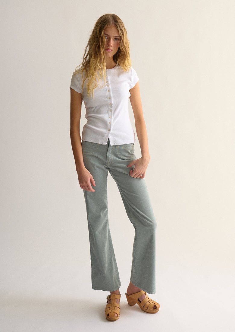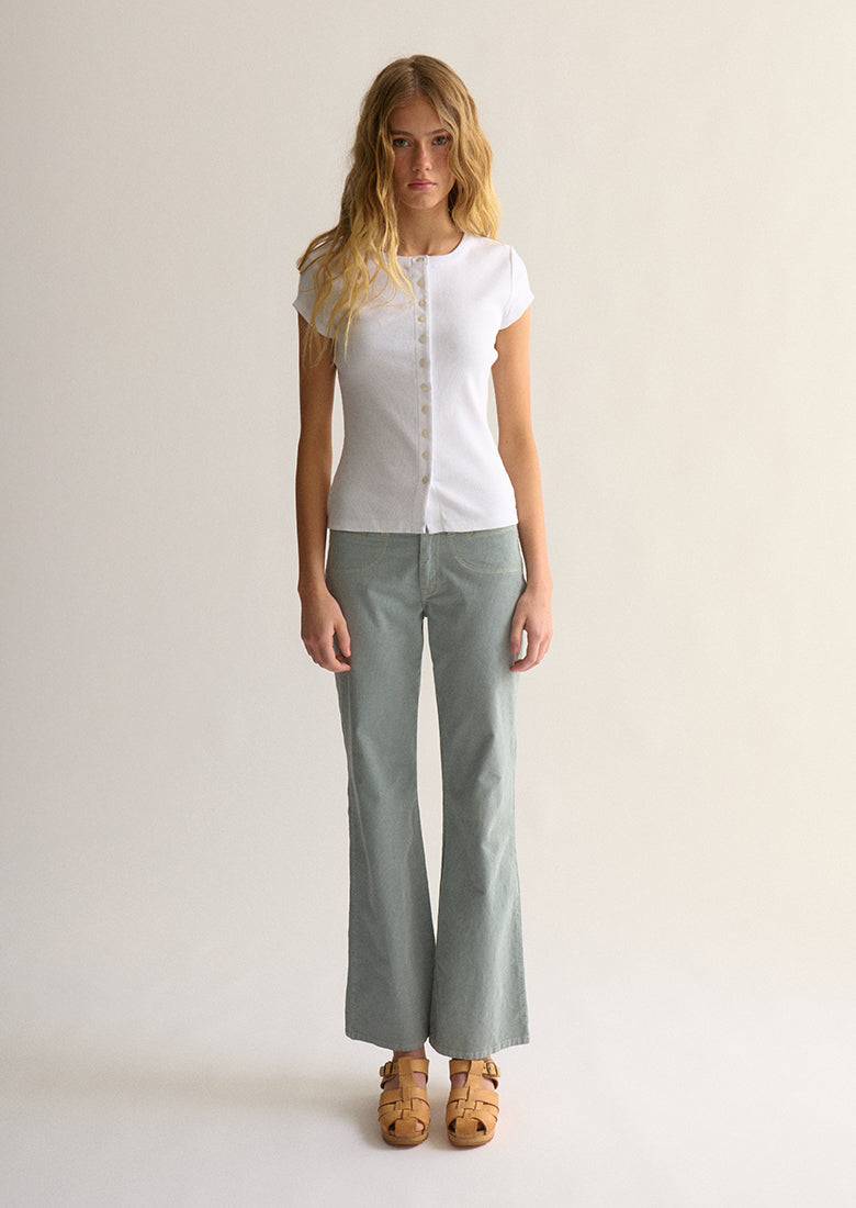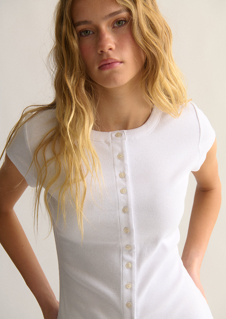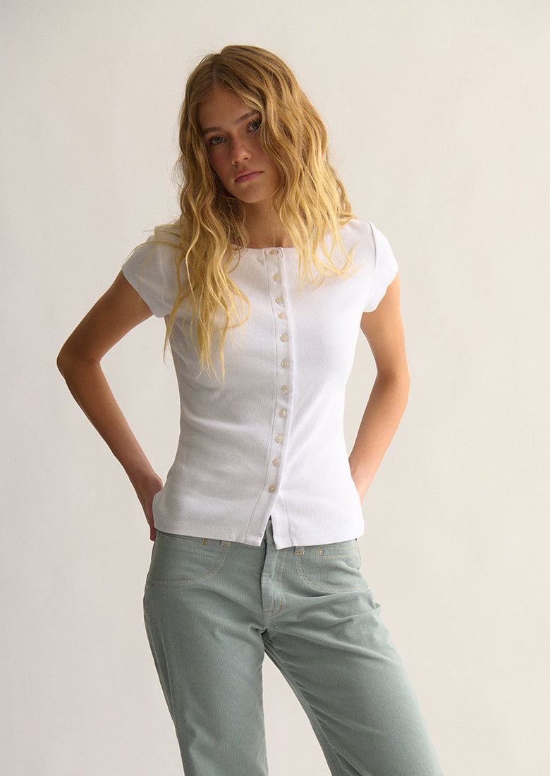 Elevate your everyday with the Lucy Tee. Crafted from a soft, stretch-ready cotton-elastane blend in a fine ribbed fabric, offering a perfect slim fit. Finished with a chic high neckline, capped sleeves, and a full button-up front, this instant classic can be styled all year round.