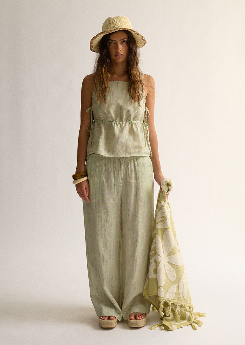 Everyone needs a pair of flowy pants for the summer. Our Noosa Pants in Seamist Stripe feature a thin waistband with drawcord, hip pockets and straight leg cut. Pair this with your favourite sneakers or sandals and wear over the top of one of our latest bikinis for the ultra beach babe look!
