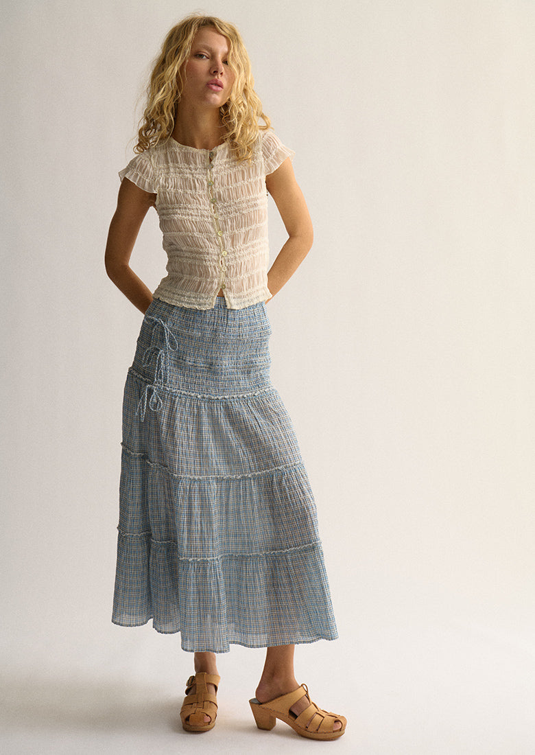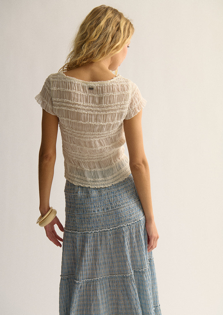 Discover everyday charm with our Rose Top. Designed with short cap sleeves and a flattering shirred bodycon fit, it offers a streamlined silhouette. The beautiful button-up front with genuine seashell buttons adds a touch of coastal whimsy. This semi-sheer top is ideal for warm days and can be beautifully complemented with our matching Rose Shorties.