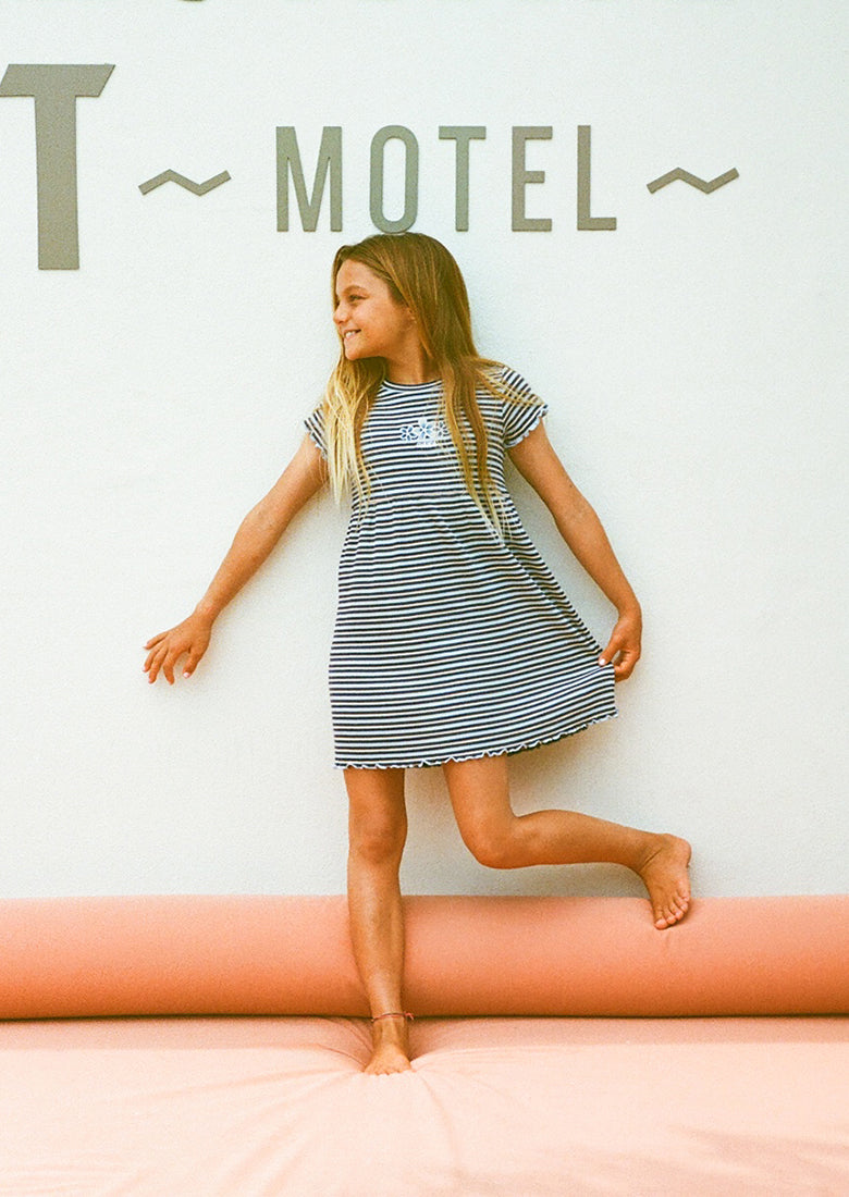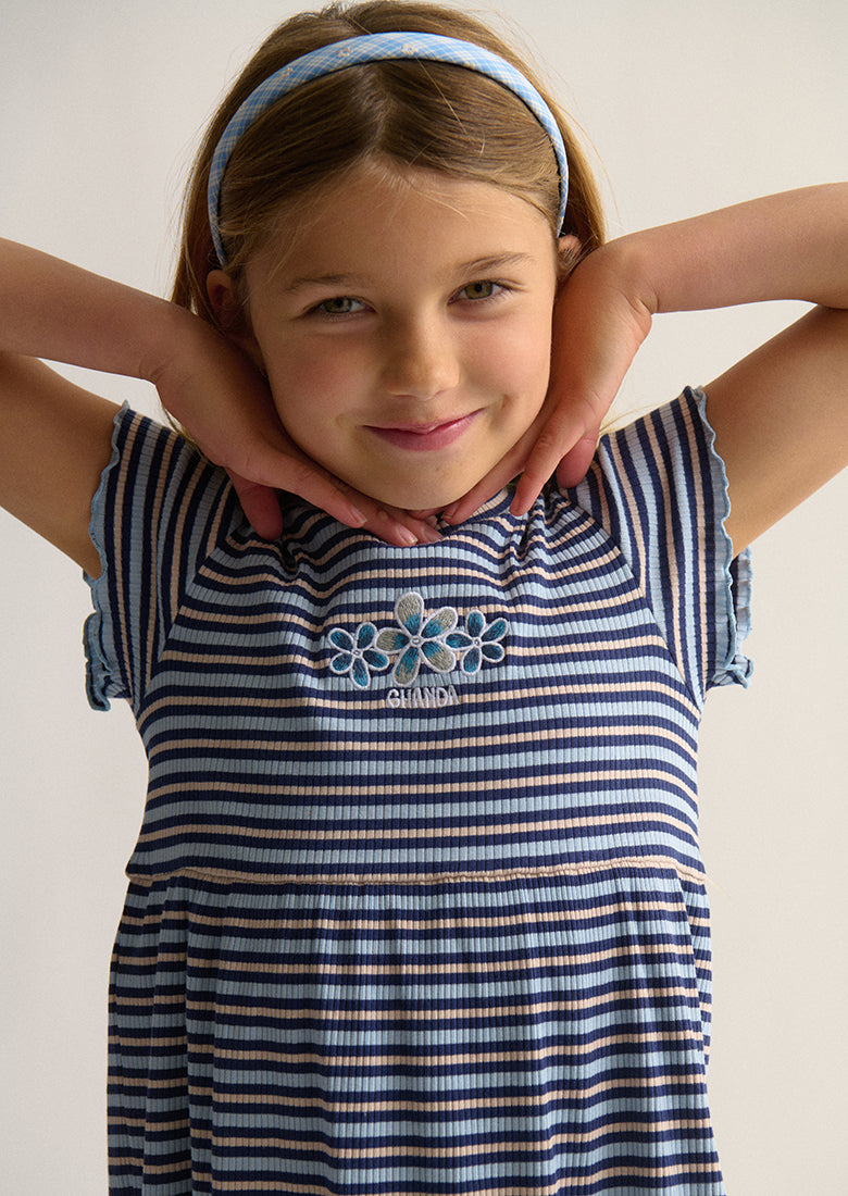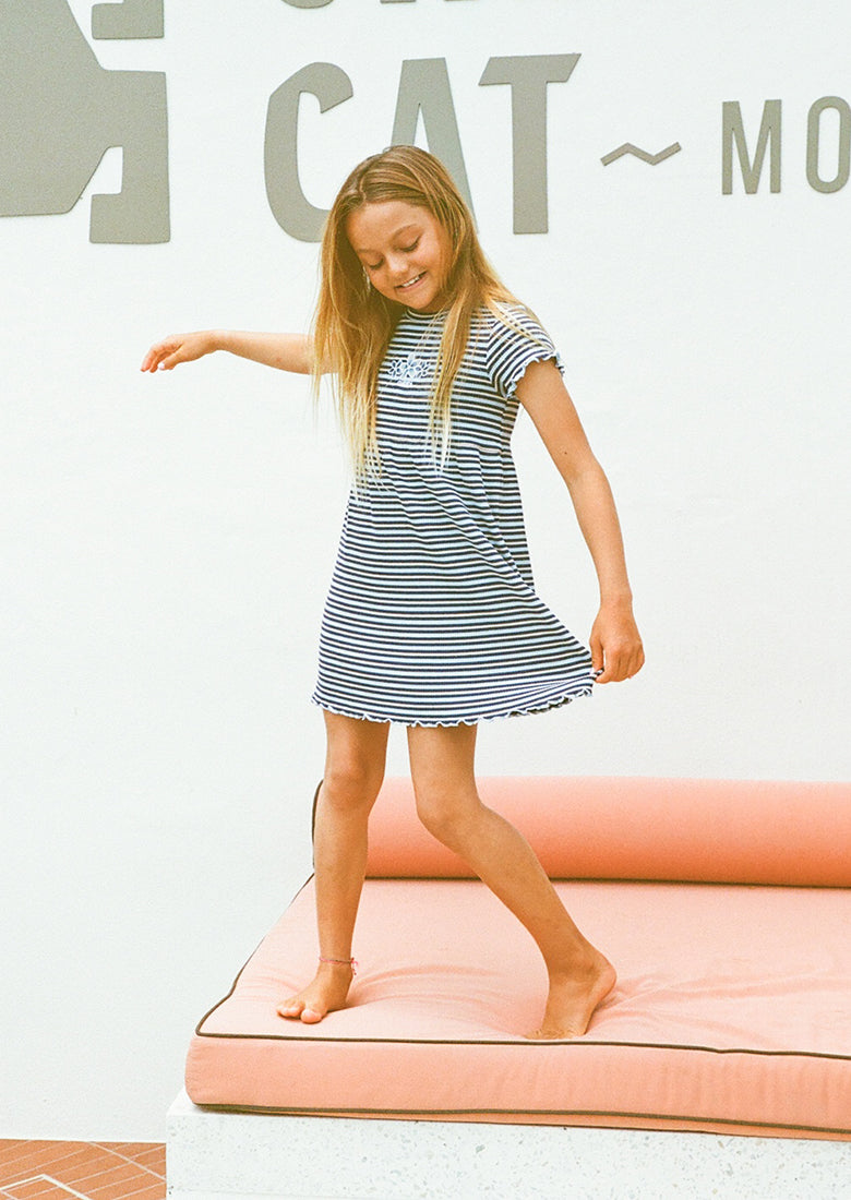 The Ruby Dress is a playful essential for any little wardrobe. Designed in a mini dress length with a T-shirt silhouette that tiers from the waist, it offers a relaxed and comfortable fit. Made from ribbed fabric with a blend of 95% cotton and 5% elastane, it provides softness with just the right amount of stretch. Finished with a cute striped pattern and front embroidery, it’s perfect for everyday adventures.