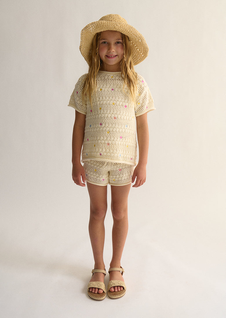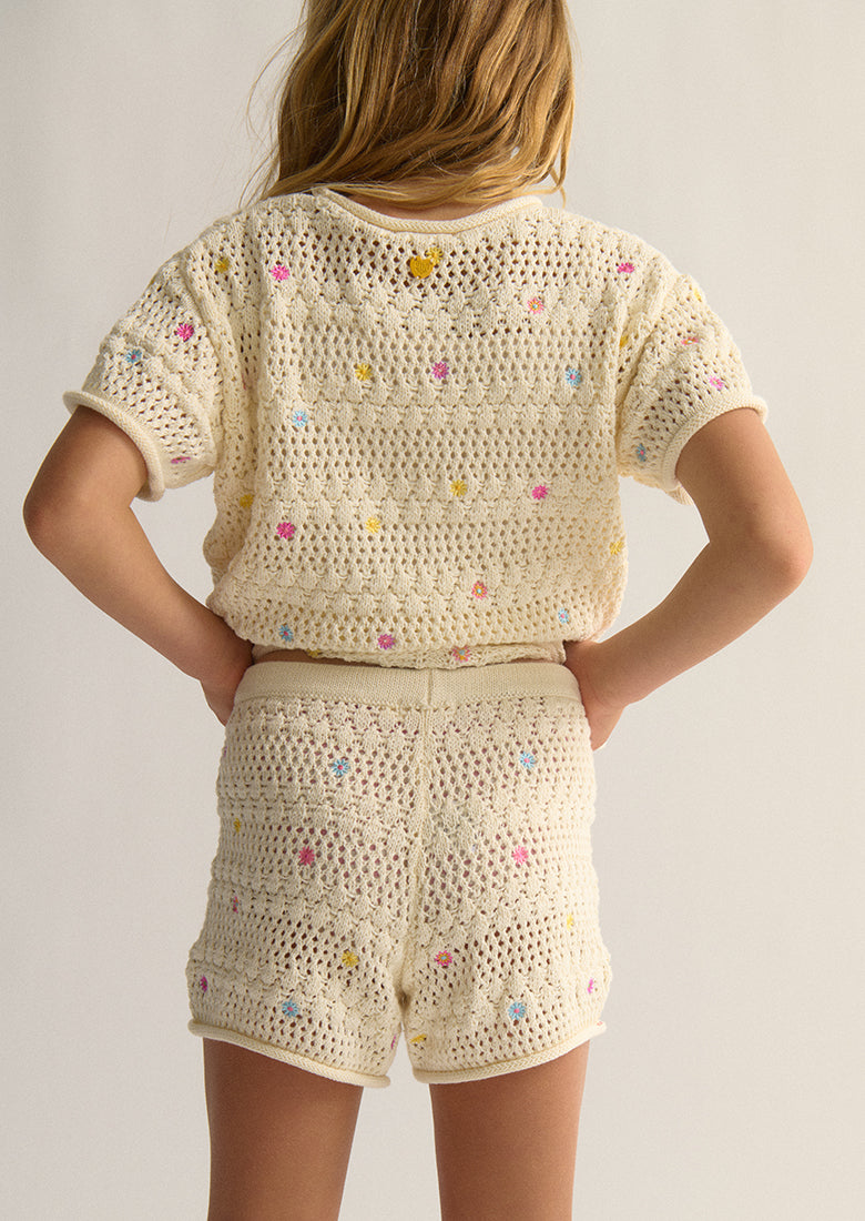 Make the most of the warmer days with our Simi Shorts in Cream-Confetti Floral! With an open knit design and an elastic waistband with drawstring, these shorts are perfect for a day out at the park or chilling at home. Plus, they come in a matching Simi Top for ultimate cuteness!