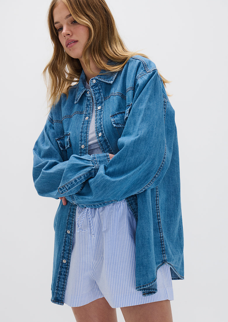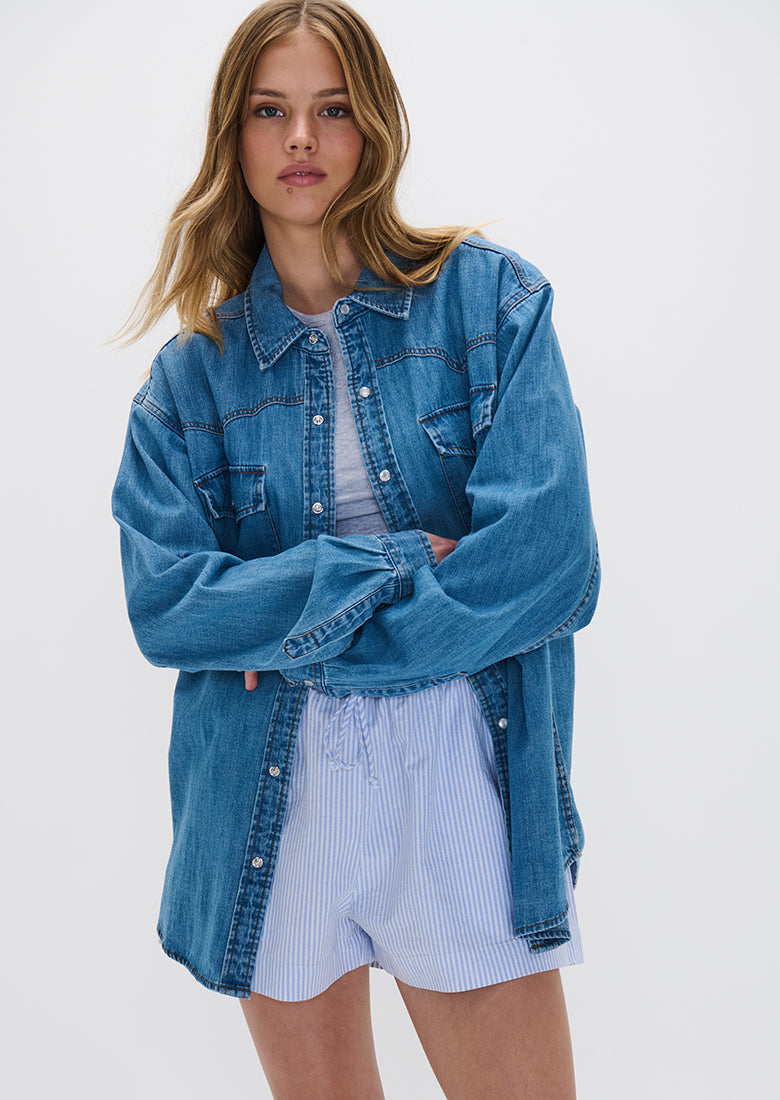 Add some flair to our wardrobe with our Southern Chambray Shirt! Lightweight and designed with a western twist, this shirt is perfect for casual days on the beach or in the city.