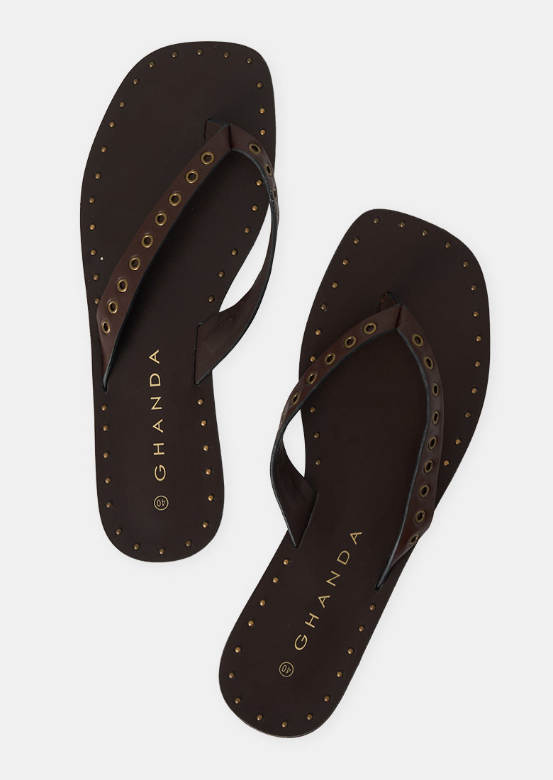 Step into easy summer style with these effortlessly cool Studded Thongs. Designed with a classic shape and elevated with metallic eyelet detailing, they bring a subtle edge to every warm-weather look. The flexible sole keeps things comfy from beach days to brunch runs, while the slim straps give them that sleek, feminine finish.