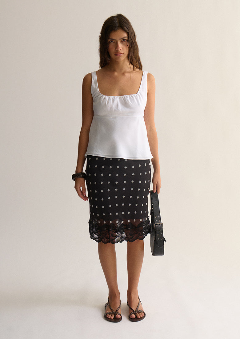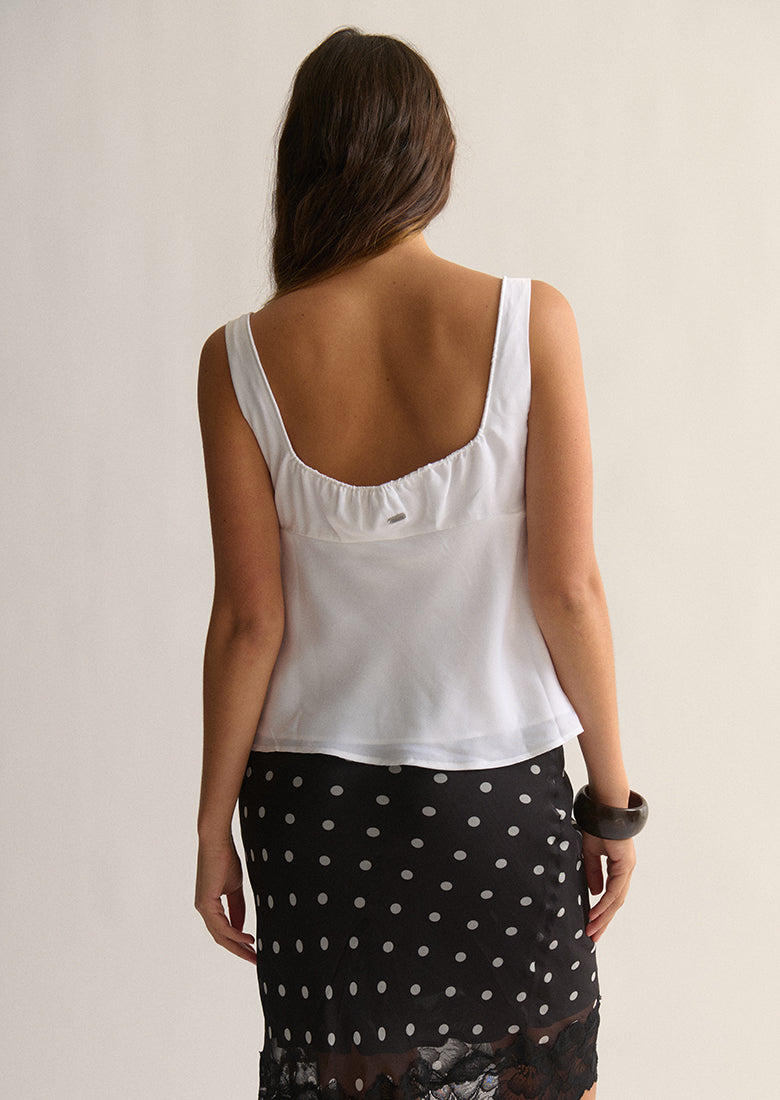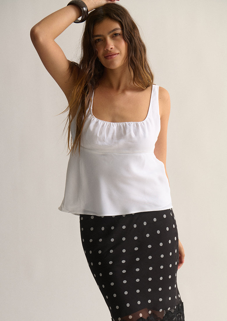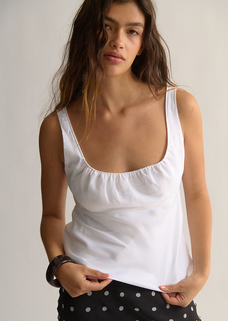 Elevate your look instantly with the Studio Top. Made from a soft, silky fabric, it drapes beautifully with a flowy, relaxed hem. The top features a wide scooped neckline with subtle gathered fabric detail and thick fixed straps for an elegant, comfortable fit, all finished with a hidden side zipper for a smooth, seamless look.