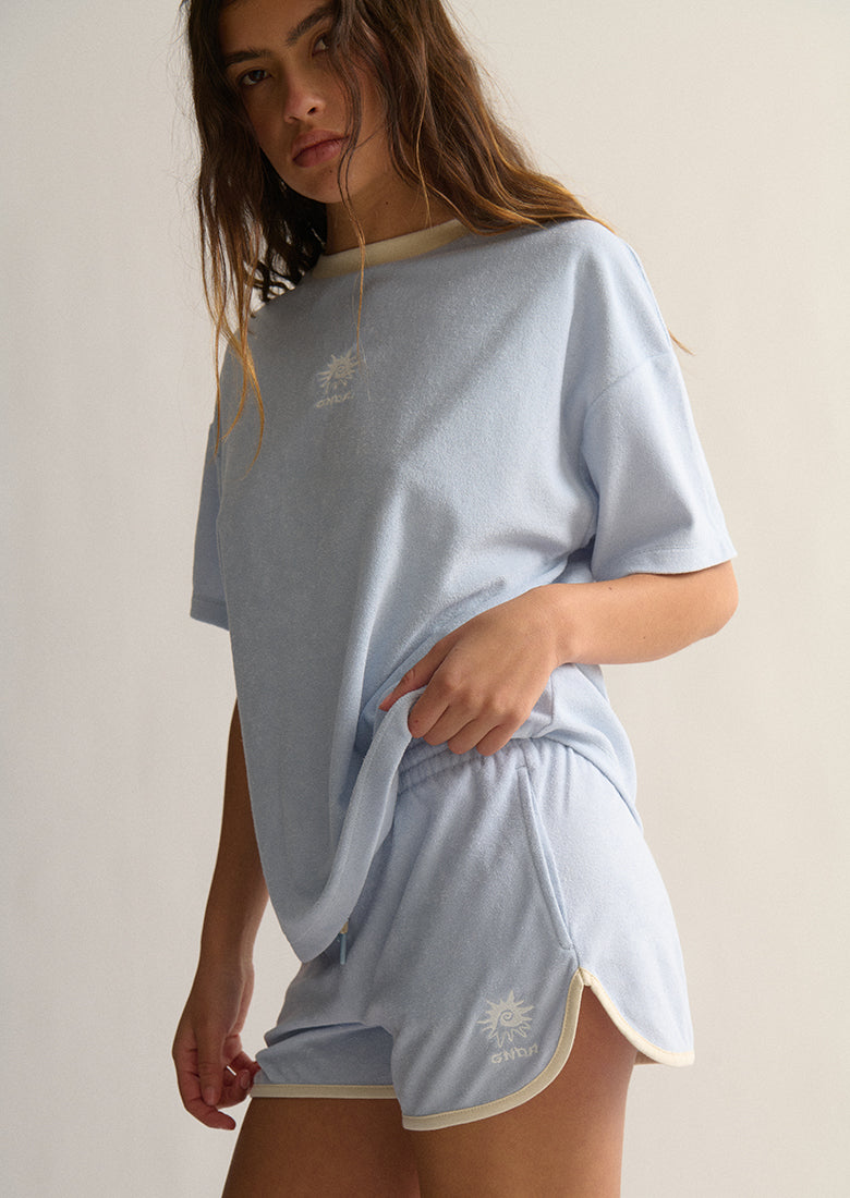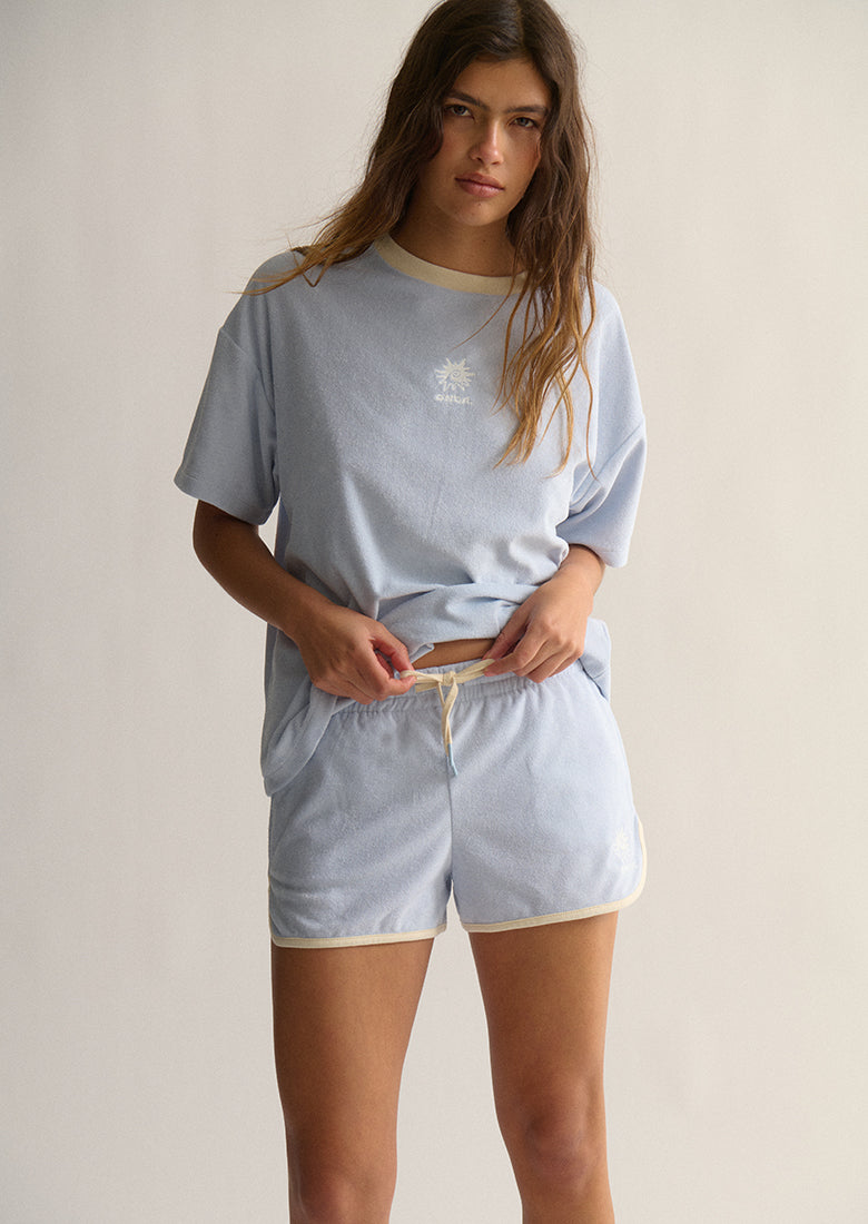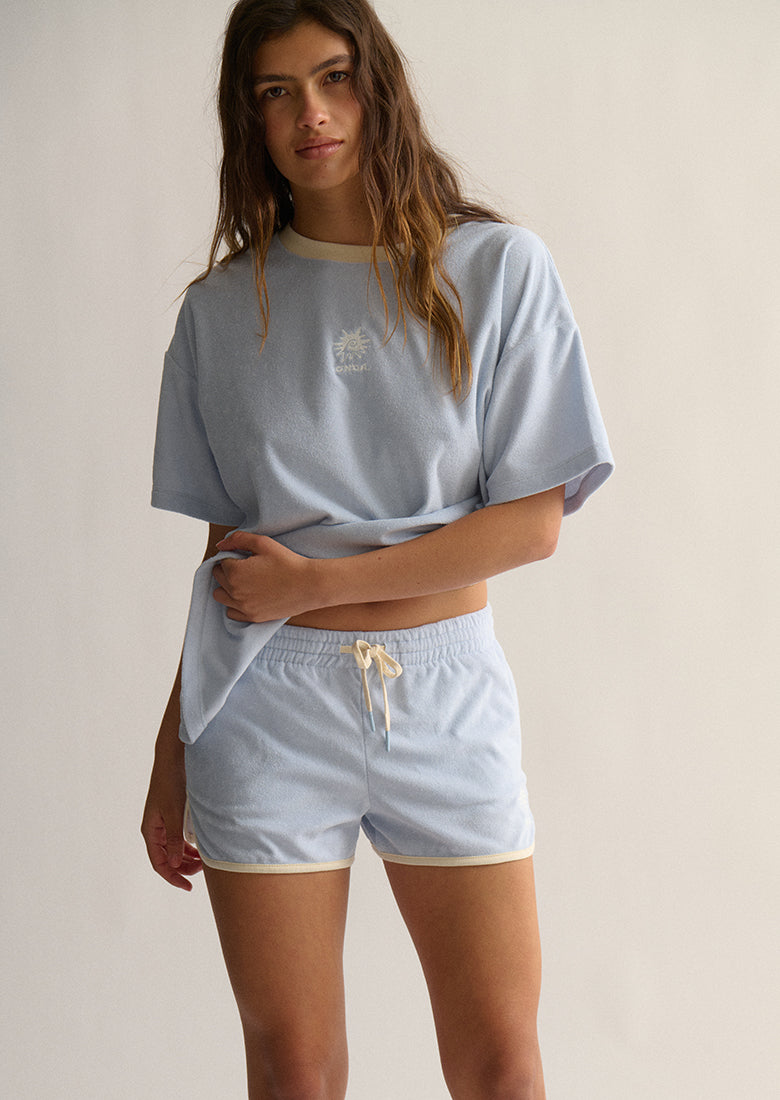 Fun in the sun starts with the Terry Shorts! Crafted from a soft cotton blend terry toweling fabric, these shorts feature a comfortable mid-rise fit and a thick elastic waistband with a drawcord. Side seam pockets hold your essentials, while a contrast hem and embroidered left leg add a playful touch. Complete the look with a matching Terry Tee or your best bikini for a beach-ready vibe.