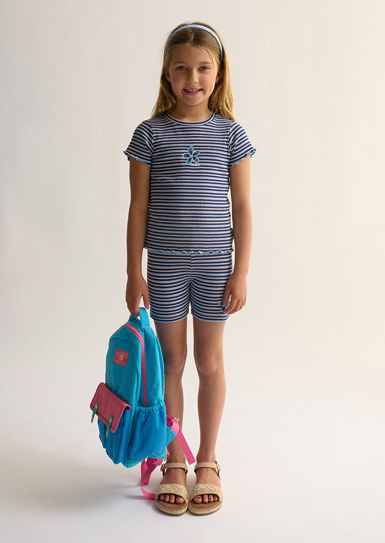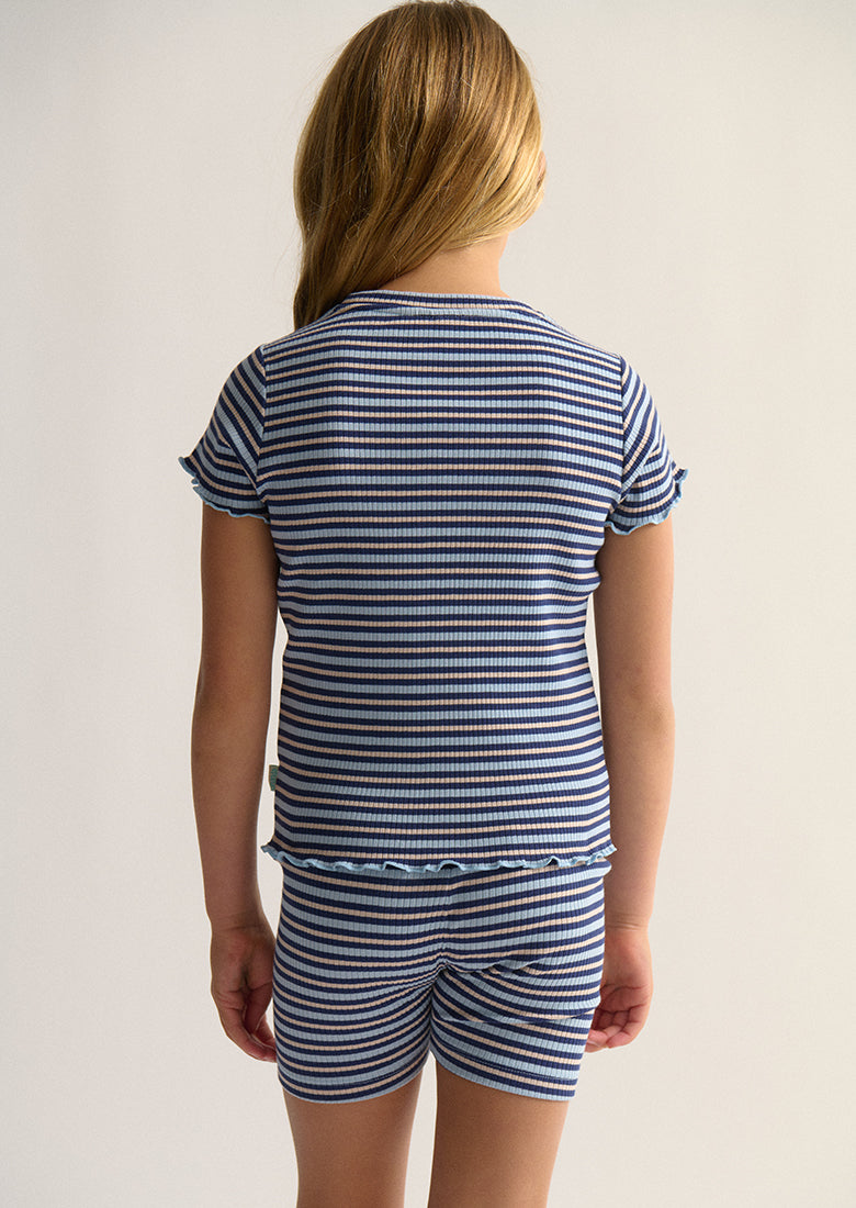 Meet her new favorite - the Whitewash Tee. This soft, stretchy ribbed t-shirt is a comfortable go-to, made from a breathable cotton blend. It has a classic crew neckline and an all-over crush stripe. The playful lettuce frill hem and sleeves and a cute chest embroidery are the perfect details, making this a top she'll love to wear all the time.