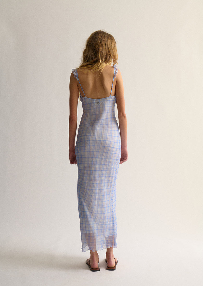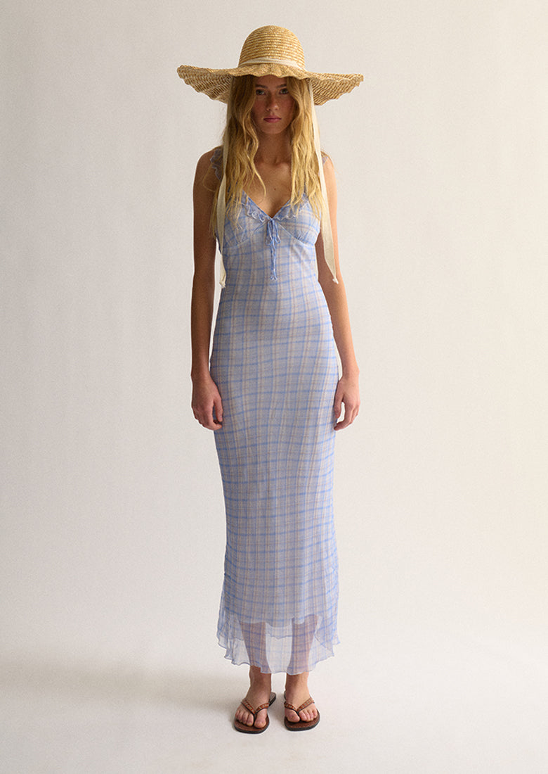 Catch the moonlight in our dreamy, Yves Maxi Dress. The V-neckline features a delicate ruffle that continues along the thin adjustable straps, adding a lovely, sweet frame to the décolletage. The generous maxi length skirt is cut from 100% rayon in a classic checkered design, ensuring it flows beautifully as you move. This lightweight, lined design is finished with a charming tie-up front detail.